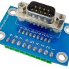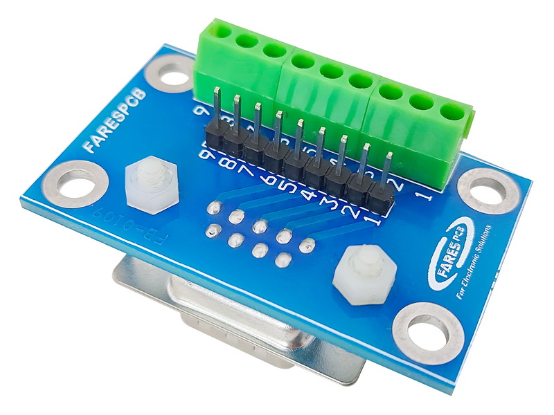 - DB9 pins are routed to pin headers and screw clamp terminals.