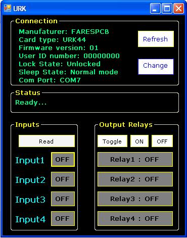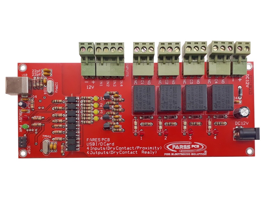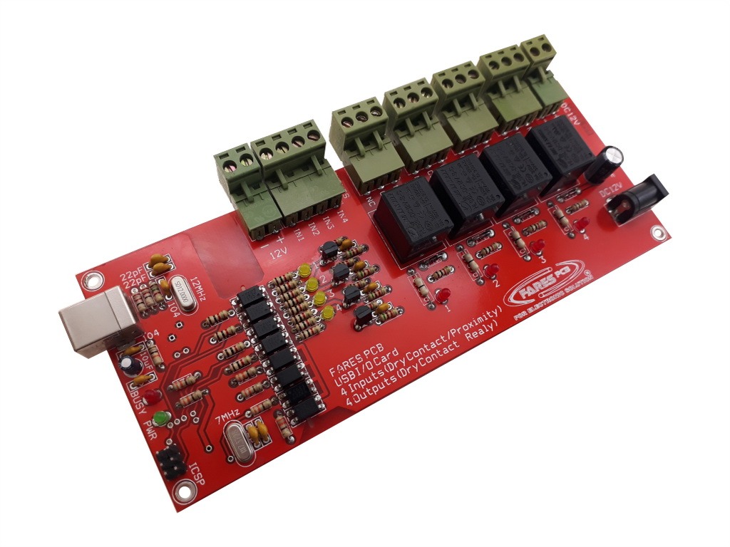Simple cheap USB-controlled data acquisition card. It supports four output relays and four inputs ( limit switch or proximity ).